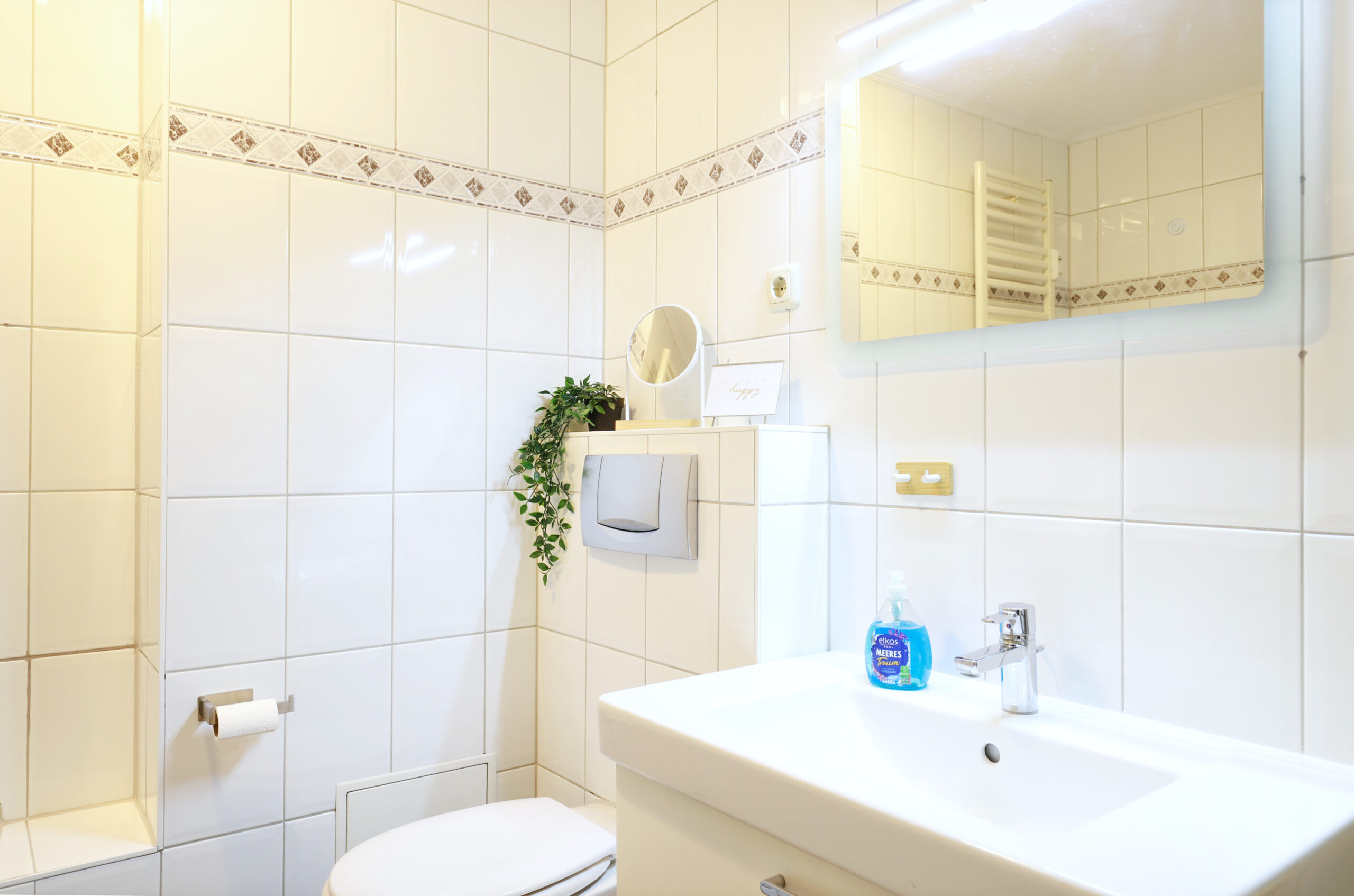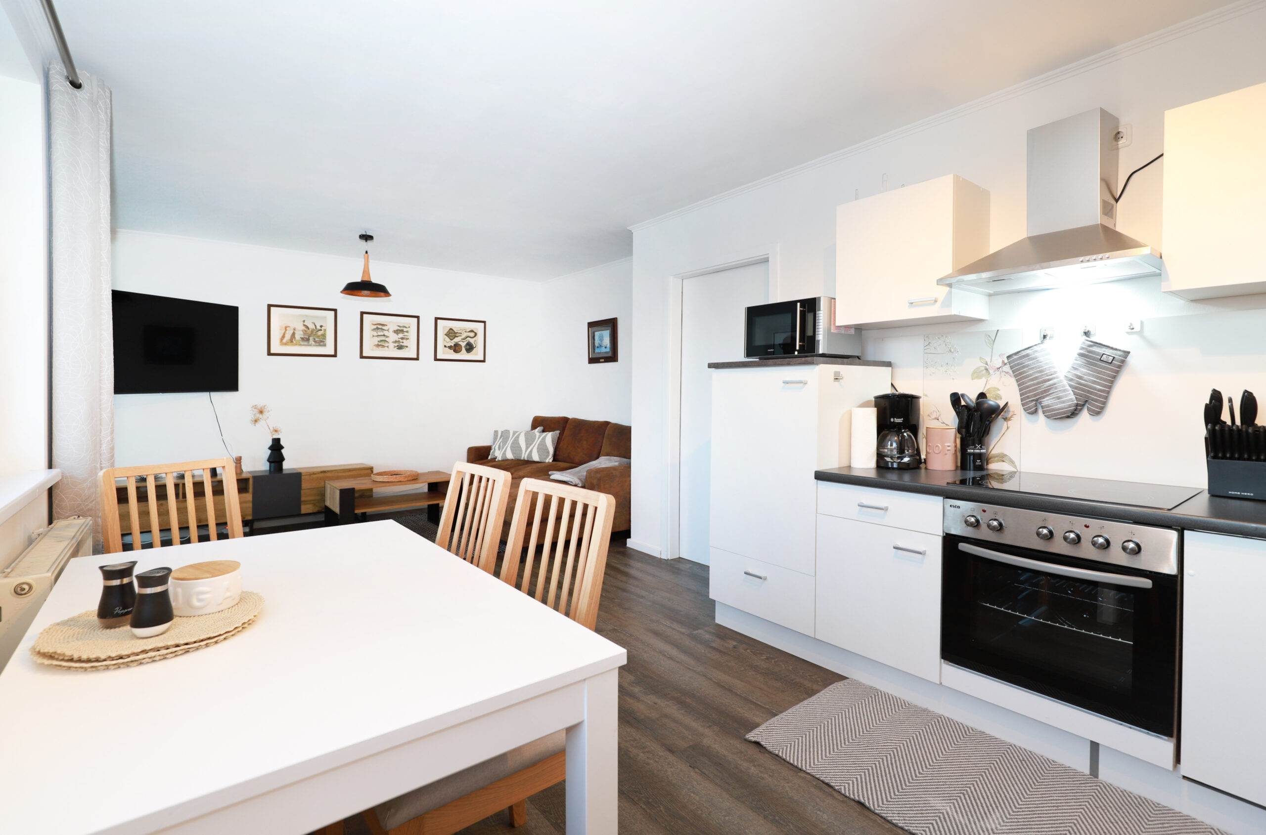 Die voll ausgestattete Küche grenzt direkt an und lädt dazu ein, den Tag mit einem ausgiebigen Frühstück zu beginnen oder den Abend in privater Runde ausklingen zu lassen. Von Herd und Kühlschrank bis hin zur Kaffeemaschine und allen wichtigen Utensilien ist alles vorhanden, was Sie für eine entspannte Selbstversorgung benötigen. Das moderne Badezimmer verfügt über eine Dusche, frische Handtücher sowie einen Haartrockner. Damit Sie sich von der ersten Minute an wohlfühlen, sind Bettwäsche und kostenfreies WLAN bei Ihrer Ankunft bereits vorbereitet.